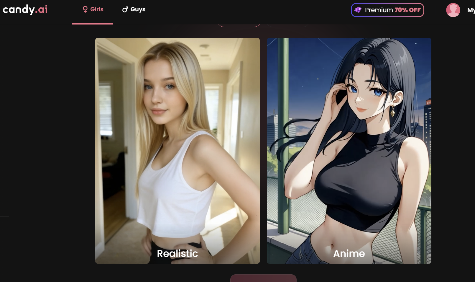 The browse screen splits into two tabs: Realistic and Anime. Both have Girls and Guys options.