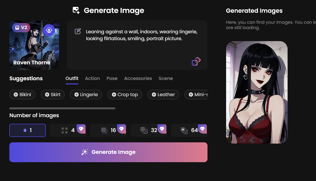 The image gen interface is clean. Pick your character, write a prompt, use the suggestion chips for outfit, action, pose, and hit Generate.