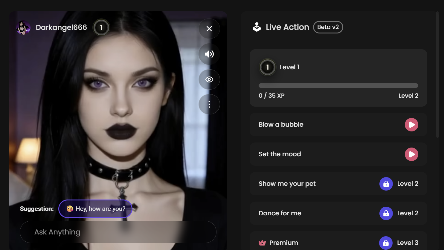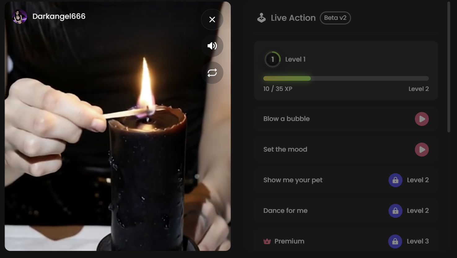 Level 2 unlocks "Show me your pet" and "Dance for me." Level 3 and above is Premium territory. The full Live Action library requires a subscription.