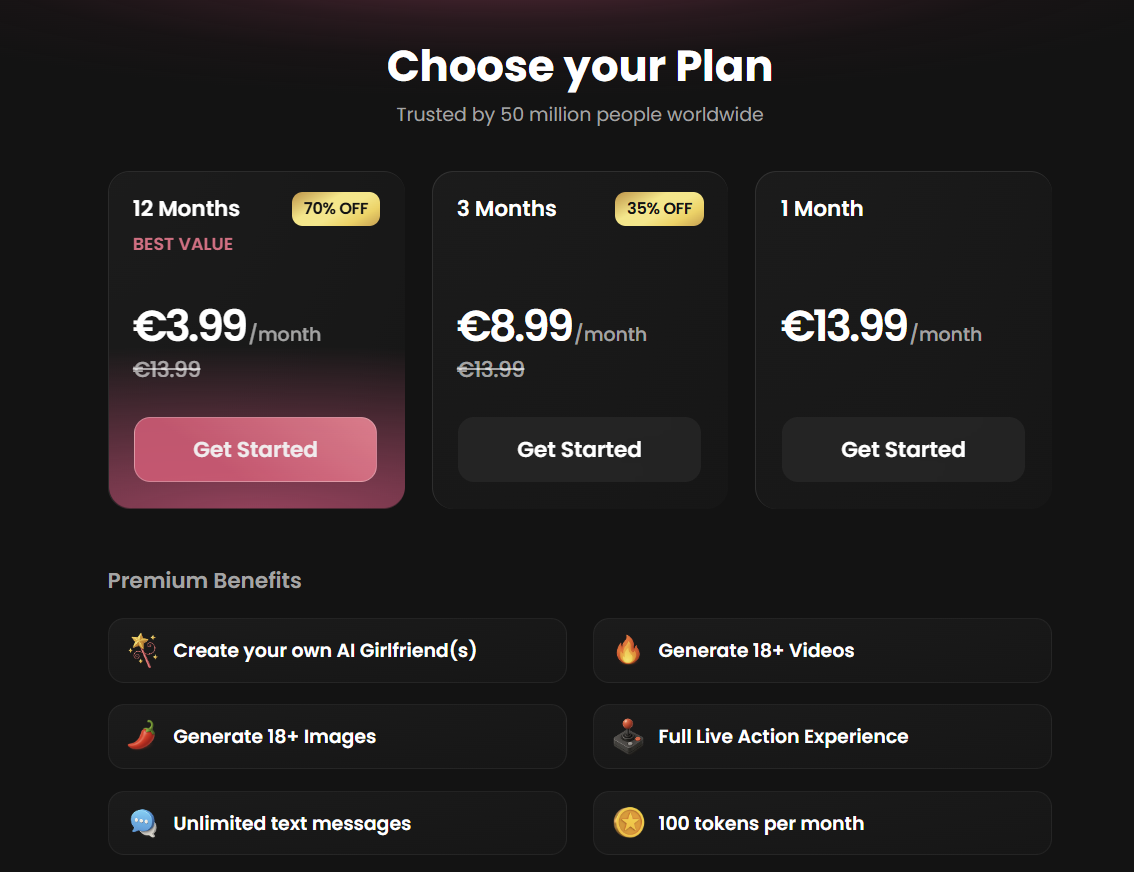 | 12 Months | €3.99/mo | Full Premium, 100 tokens, best value |